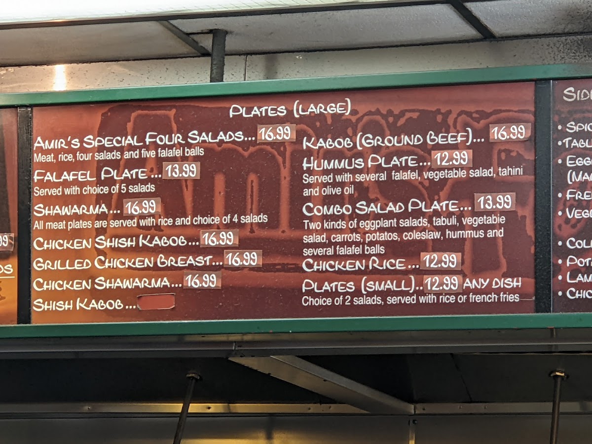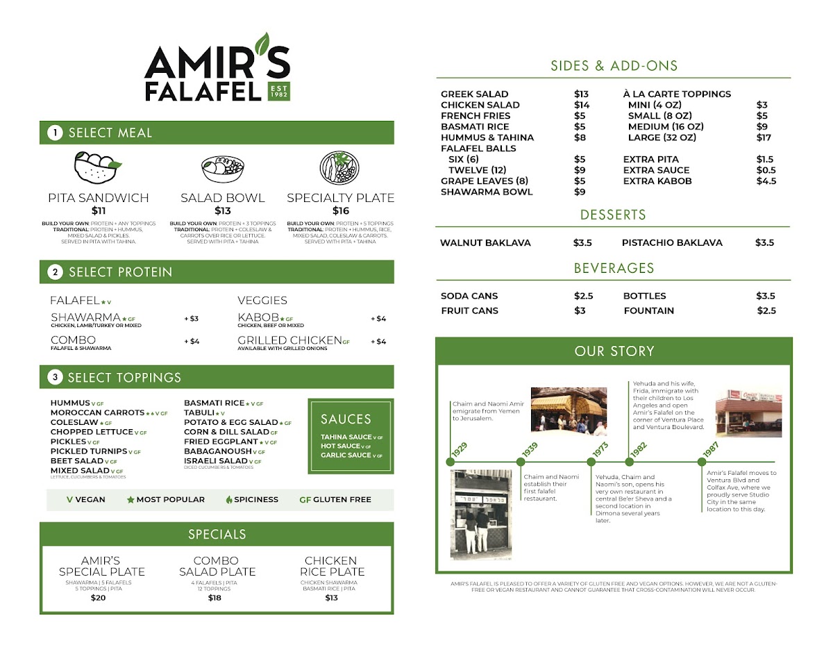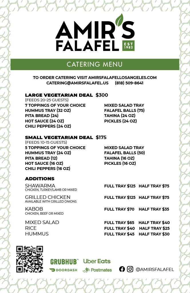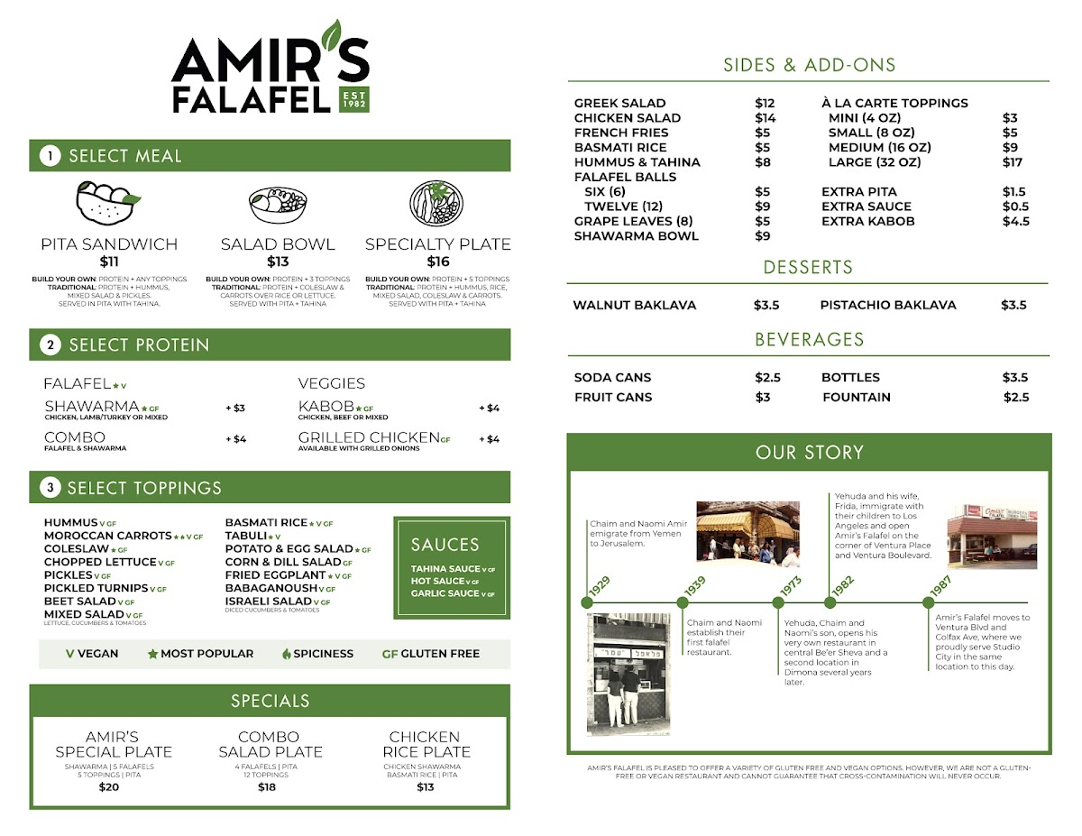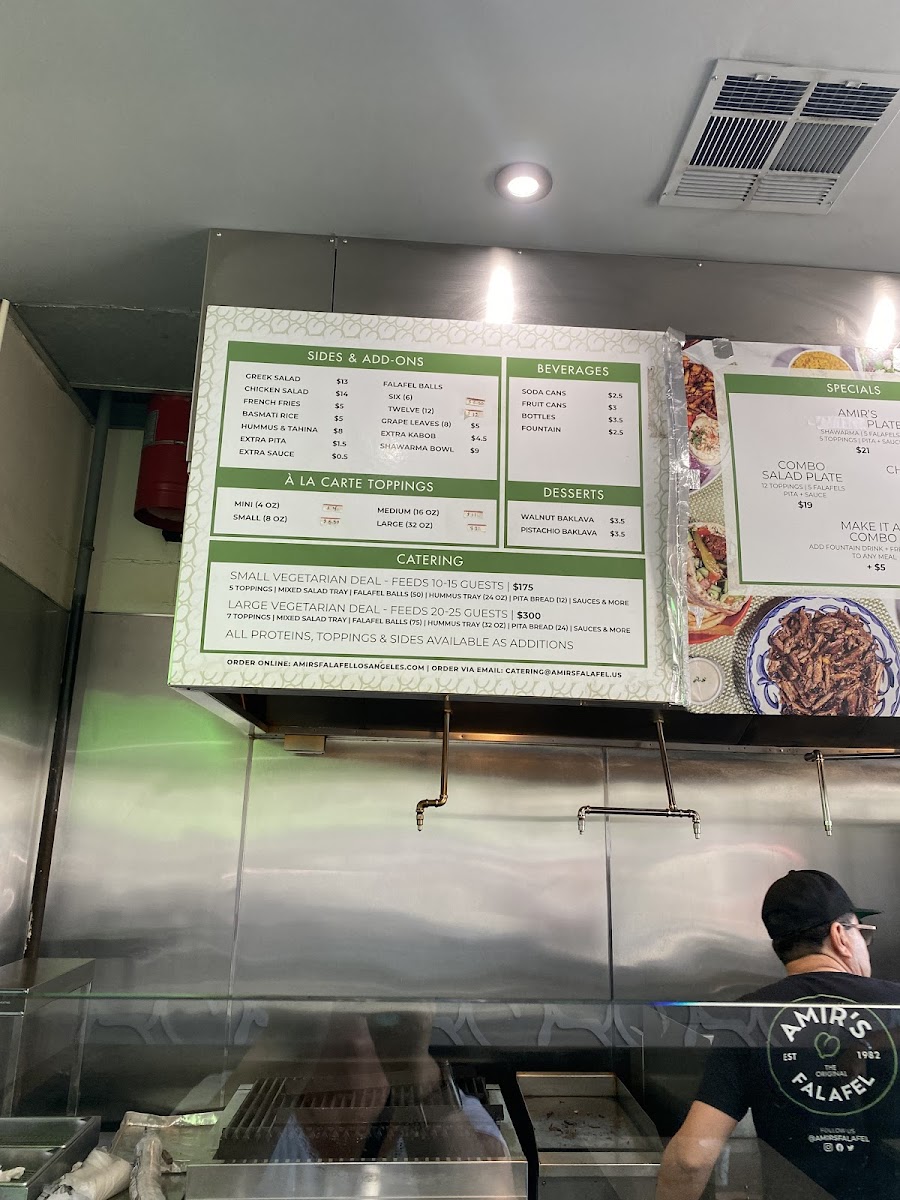 From a reviewer’s perspective, the menu at Amir's Falafel reflects a well-rounded Middle Eastern offering that balances everyday comfort food with options suitable for sharing and catering. The main strength of the menu lies in its flexibility: diners can build a satisfying meal from core items like the Specialty Plate, Salad Bowl, Laffa Wrap, or Pita Sandwich, each designed to highlight bold flavors and generous portions. For heartier choices, the Combo Salad Plate, Amir’s Special Plate, and Chicken Rice Plate stand out as complete meals that bring together proteins, grains, and fresh sides in a way that feels both filling and thoughtfully composed.